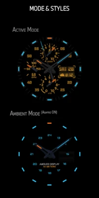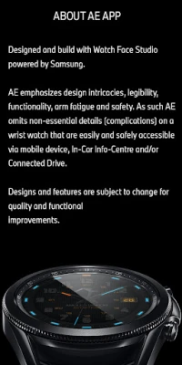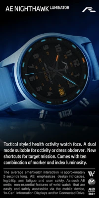 A timeless design enchants lovers of classic collection. Suits for any occasion, complemented with sports activity data on AE’s signature “dual mode”, hidden away on secondary dial. And as usual, AE’s vivid AOD luminosity. Illuminator version was created by request from Nunzio Cancelmo, for a darker dial and brilliant monotonous AOD. A dual mode, tactical styled health activity watch face. Two new shortcuts being Compass and Stop watch for target mission (applicable for Samsung Smartwatch).