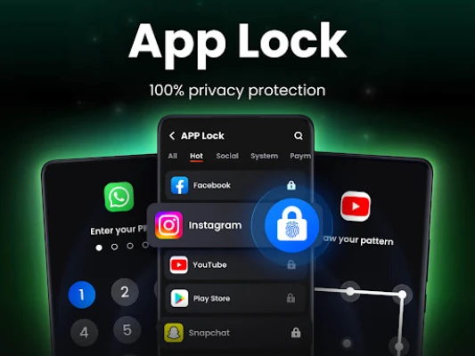 App Lock, easily lock apps and protect your private data with one click. Guard your phone with PIN, pattern or fingerprint.