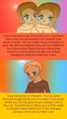 Char-M is a personality test and character matching app where based on replies to a set of questions you'll be given a character. The results might show one or more characters depending on the answers you pick for the questions.