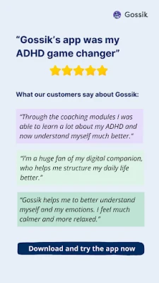 The Gossik Char app supports people with ADHD in better organizing their daily life and strengthening their independence. Chat with certified professionals or with your virtual companion to better understand yourself. Immediate, simple support – guaranteed.