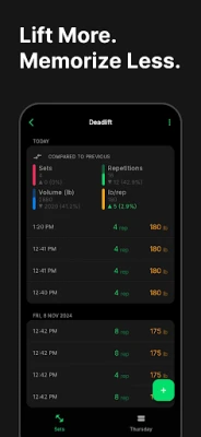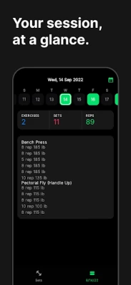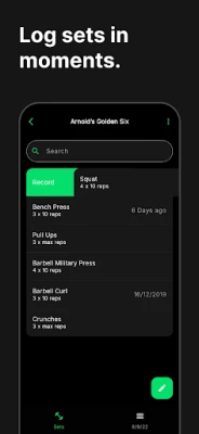 • Replicate previous sets with a simple swipe, or log a new set for an exercise just as easily.